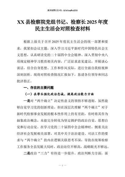 【七哥公文】2026年:XX县检察院党组书记、检察长2025年度民主生活会对照检查材料+更多免费公文+VX:QiGeGongWen2024