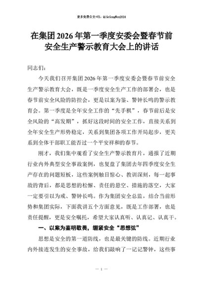 【七哥公文】2026年:在集团2026年第一季度安委会暨春节前安全生产警示教育大会上的讲话+更多免费公文+VX:QiGeGongWen2024