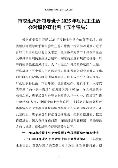 【七哥公文】2026年:市委组织部领导班子2025年度民主生活会对照检查材料(五个带头)+更多免费公文+VX:QiGeGongWen2024