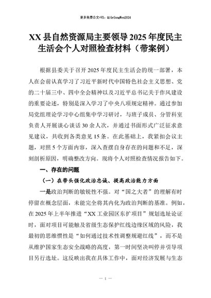 【七哥公文】2026年:XX县自然资源局主要领导2025年度民主生活会个人对照检查材料(带案例)+更多免费公文+VX:QiGeGongWen2024