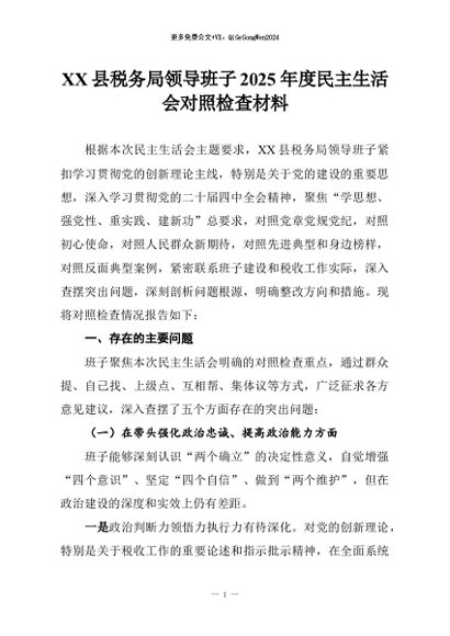 【七哥公文】2026年:XX县税务局领导班子2025年度民主生活会对照检查材料+更多免费公文+VX:QiGeGongWen2024