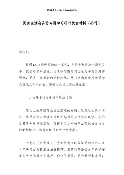 【七哥公文】2026年:民主生活会会前专题学习研讨发言材料(公司)_副本+更多免费公文+VX:QiGeGongWen2024