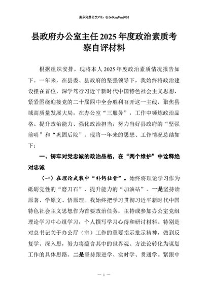【七哥公文】2026年:县政府办公室主任2025年度政治素质考察自评材料+更多免费公文+VX:QiGeGongWen2024