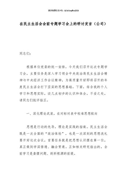 【七哥公文】2026年:在民主生活会会前专题学习会上的研讨发言(公司)_副本+更多免费公文+VX:QiGeGongWen2024