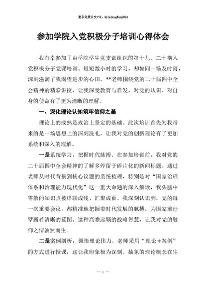 【七哥公文】2026年:参加学院入党积极分子培训心得体会+更多免费公文+VX:QiGeGongWen2024