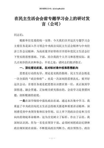 / 【七哥公文】2026年:在民主生活会会前专题学习会上的研讨发言(公司)+更多免费公文+VX:QiGeGongWen2024