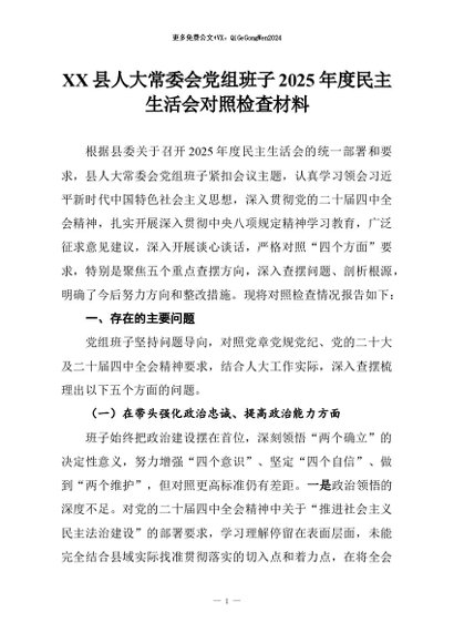 【七哥公文】2026年:XX县人大常委会党组班子2025年度民主生活会对照检查材料+更多免费公文+VX:QiGeGongWen2024