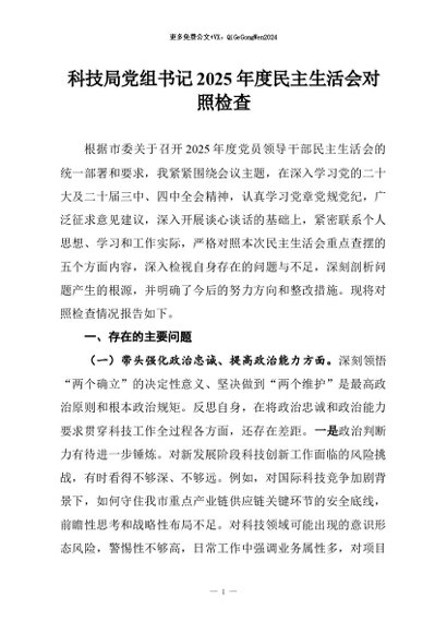 【七哥公文】2026年:科技局党组书记2025年度民主生活会对照检查+更多免费公文+VX:QiGeGongWen2024