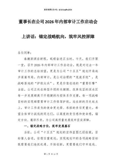【七哥公文】2026年:董事长在公司2026年内部审计工作启动会上讲话:锚定战略航向,筑牢风控屏障+更多免费公文+VX:QiGeGongWen2024