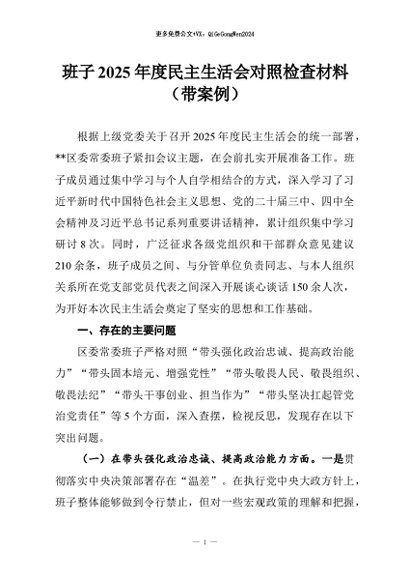 【七哥公文】2026年:班子2025年度民主生活会对照检查材料(带案例)+更多免费公文+VX:QiGeGongWen2024