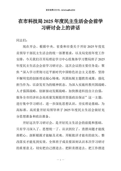 【七哥公文】2026年:在市科技局2025年度民主生活会会前学习研讨会上的讲话+更多免费公文+VX:QiGeGongWen2024