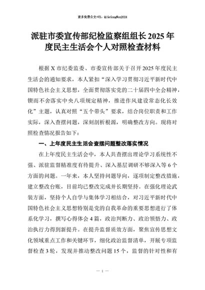 【七哥公文】2026年:派驻市委宣传部纪检监察组组长2025年度民主生活会个人对照检查材料+更多免费公文+VX:QiGeGongWen2024