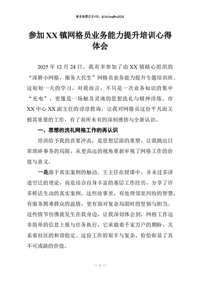 【七哥公文】2026年:参加XX镇网格员业务能力提升培训心得体会+更多免费公文+VX:QiGeGongWen2024
