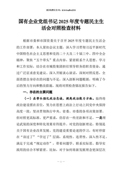 【七哥公文】2026年:国有企业党组书记2025年度专题民主生活会对照检查材料+更多免费公文+VX:QiGeGongWen2024
