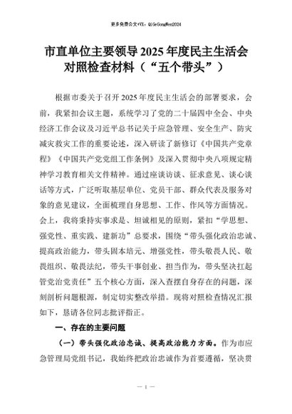 【七哥公文】2026年:市直单位主要领导2025年度民主生活会对照检查材料(“五个带头”)+更多免费公文+VX:QiGeGongWen2024