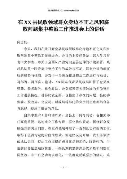 【七哥公文】2026年:在XX县民政领域群众身边不正之风和腐败问题集中整治工作推进会上的讲话+更多免费公文+VX:QiGeGongWen2024