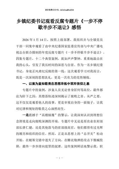 【七哥公文】2026年:乡镇纪委书记观看反腐专题片《一步不停歇半步不退让》感悟+更多免费公文+VX:QiGeGongWen2024