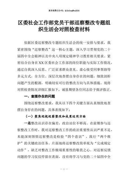 【七哥公文】2026年:区委社会工作部党员干部巡察整改专题组织生活会对照检查材料+更多免费公文+VX:QiGeGongWen2024