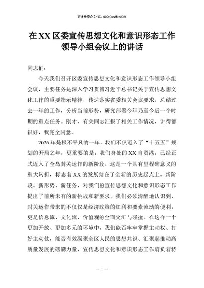 【七哥公文】2026年:在XX区委宣传思想文化和意识形态工作领导小组会议上的讲话+更多免费公文+VX:QiGeGongWen2024