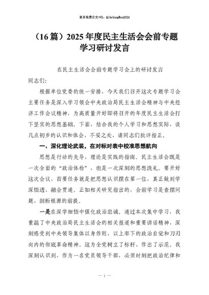 【七哥公文】2026年:(16篇)2025年度民主生活会会前专题学习研讨发言+更多免费公文+VX:QiGeGongWen2024