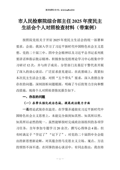 【七哥公文】2026年:市人民检察院综合部主任2025年度民主生活会个人对照检查材料(带案例)+更多免费公文+VX:QiGeGongWen2024