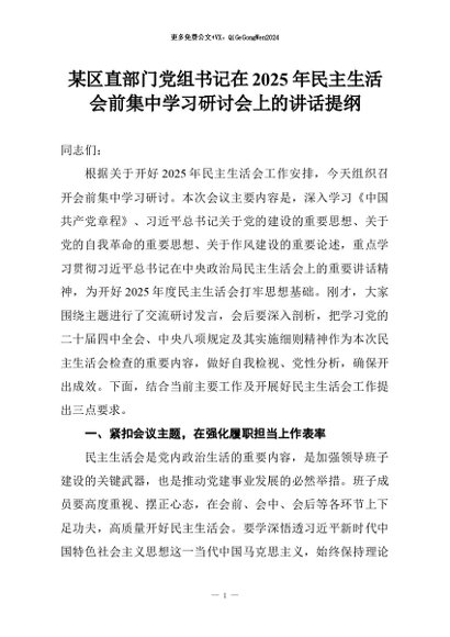 【七哥公文】2026年:某区直部门党组书记在2025年民主生活会前集中学习研讨会上的讲话提纲+更多免费公文+VX:QiGeGongWen2024