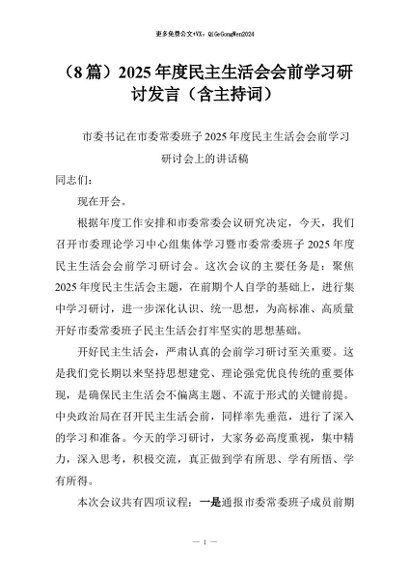 【七哥公文】2026年:(8篇)2025年度民主生活会会前学习研讨发言(含主持词)+更多免费公文+VX:QiGeGongWen2024