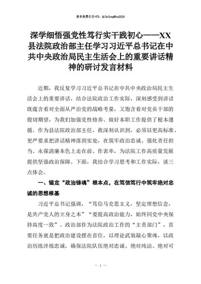 【七哥公文】2026年:深学细悟强党性笃行实干践初心——XX县法院政治部主任学习习近平总书记在中共中央政治局民主生活会上的重要讲话精神的研讨发言材料+更多免费公文+VX:QiGeGongWen2024