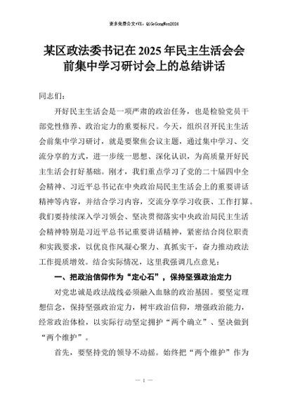 【七哥公文】2026年:某区政法委书记在2025年民主生活会会前集中学习研讨会上的总结讲话+更多免费公文+VX:QiGeGongWen2024