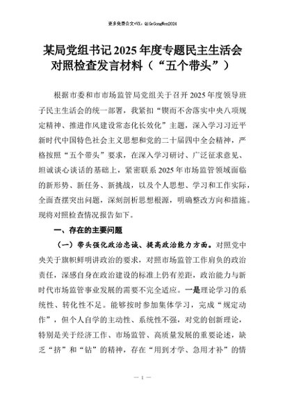 【七哥公文】2026年:某局党组书记2025年度专题民主生活会对照检查发言材料(“五个带头”)+更多免费公文+VX:QiGeGongWen2024