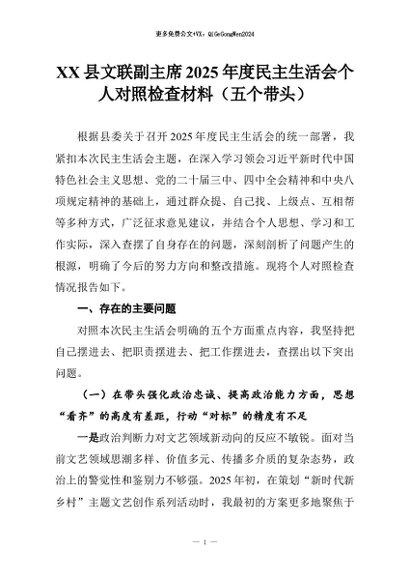【七哥公文】2026年:XX县文联副主席2025年度民主生活会个人对照检查材料(五个带头)+更多免费公文+VX:QiGeGongWen2024