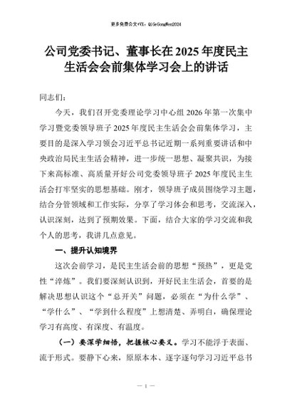 【七哥公文】2026年:公司党委书记、董事长在2025年度民主生活会会前集体学习会上的讲话+更多免费公文+VX:QiGeGongWen2024