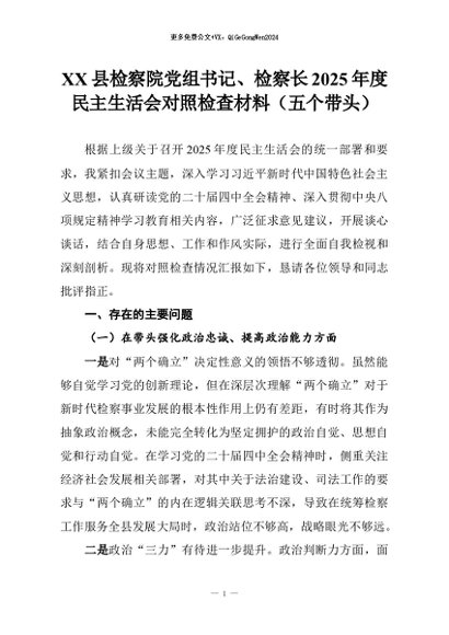 【七哥公文】2026年:XX县检察院党组书记、检察长2025年度民主生活会对照检查材料(五个带头)+更多免费公文+VX:QiGeGongWen2024