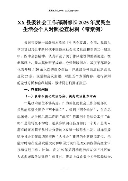 【七哥公文】2026年:XX县委社会工作部副部长2025年度民主生活会个人对照检查材料(带案例)+更多免费公文+VX:QiGeGongWen2024