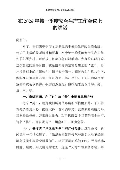 / 【七哥公文】2026年:在2026年第一季度安全生产工作会议上的讲话+更多免费公文+VX:QiGeGongWen2024