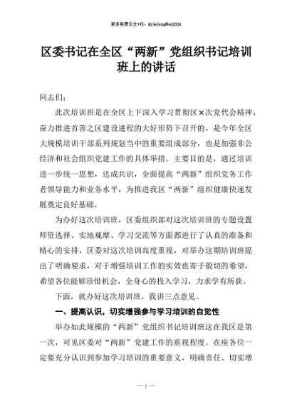 / 【七哥公文】2026年:区委书记在全区“两新”党组织书记培训班上的讲话+更多免费公文+VX:QiGeGongWen2024