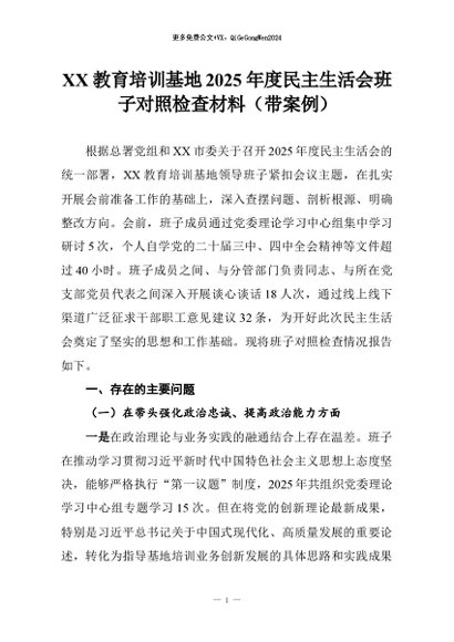 【七哥公文】2026年:XX教育培训基地2025年度民主生活会班子对照检查材料(带案例)+更多免费公文+VX:QiGeGongWen2024