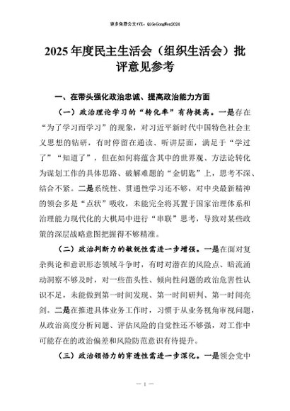 【七哥公文】2026年:2025年度民主生活会(组织生活会)批评意见参考+更多免费公文+VX:QiGeGongWen2024