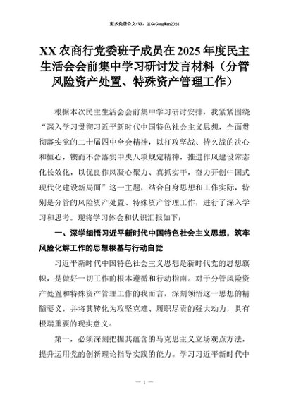 【七哥公文】2026年:XX农商行党委班子成员在2025年度民主生活会会前集中学习研讨发言材料(分管风险资产处置、特殊资产管理工作)+更多免费公文+VX:QiGeGongWen2024