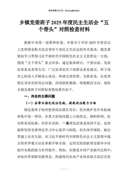 【七哥公文】2026年:乡镇党委班子2025年度民主生活会“五个带头”对照检查材料+更多免费公文+VX:QiGeGongWen2024