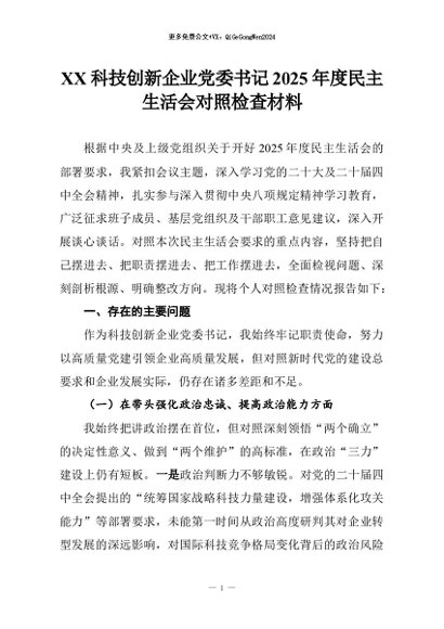 【七哥公文】2026年:XX科技创新企业党委书记2025年度民主生活会对照检查材料+更多免费公文+VX:QiGeGongWen2024