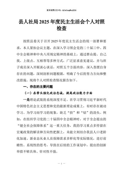 【七哥公文】2026年:县人社局2025年度民主生活会个人对照检查+更多免费公文+VX:QiGeGongWen2024