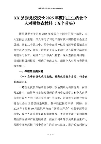【七哥公文】2026年:XX县委党校校长2025年度民主生活会个人对照检查材料(五个带头)+更多免费公文+VX:QiGeGongWen2024