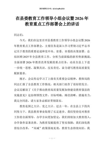 【七哥公文】2026年:在县委教育工作领导小组会议暨2026年教育重点工作部署会上的讲话+更多免费公文+VX:QiGeGongWen2024