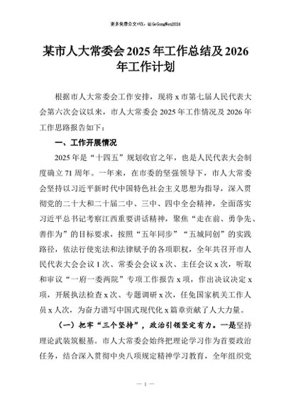 【七哥公文】2026年:某市人大常委会2025年工作总结及2026年工作计划+更多免费公文+VX:QiGeGongWen2024