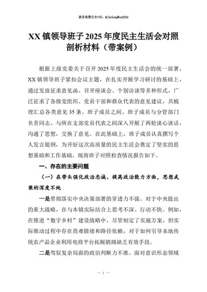 【七哥公文】2026年:XX镇领导班子2025年度民主生活会对照剖析材料(带案例)+更多免费公文+VX:QiGeGongWen2024