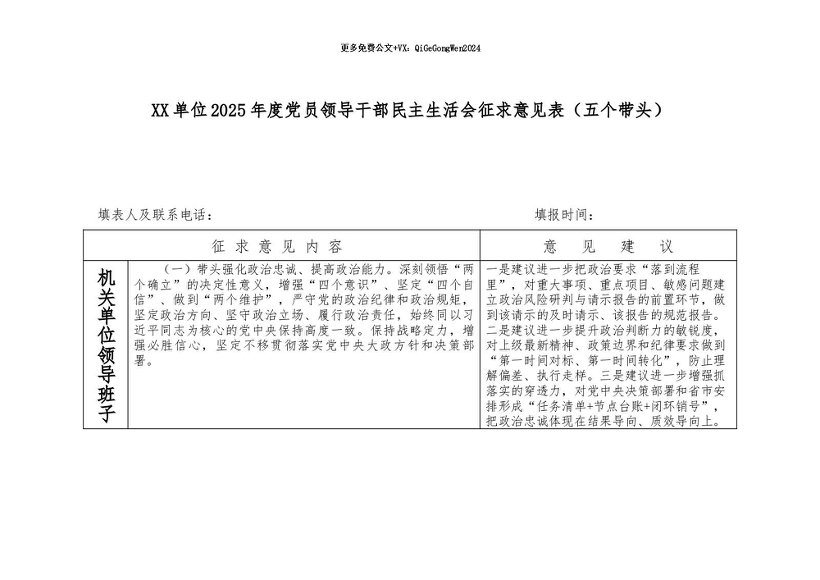 【七哥公文】2026年:XX单位2025年度党员领导干部民主生活会征求意见表(五个带头)+更多免费公文+VX:QiGeGongWen2024
