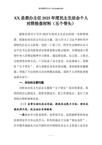 【七哥公文】2026年:XX县委办主任2025年度民主生活会个人对照检查材料(五个带头)+更多免费公文+VX:QiGeGongWen2024