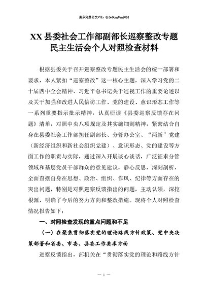 【七哥公文】2026年:XX县委社会工作部副部长巡察整改专题民主生活会个人对照检查材料+更多免费公文+VX:QiGeGongWen2024