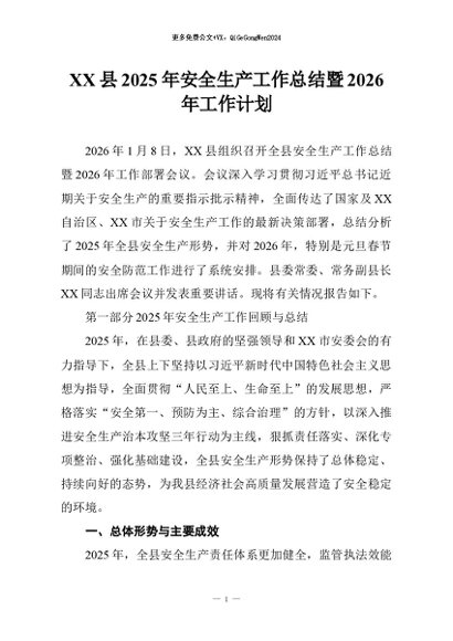 【七哥公文】2026年:XX县2025年安全生产工作总结暨2026年工作计划+更多免费公文+VX:QiGeGongWen2024